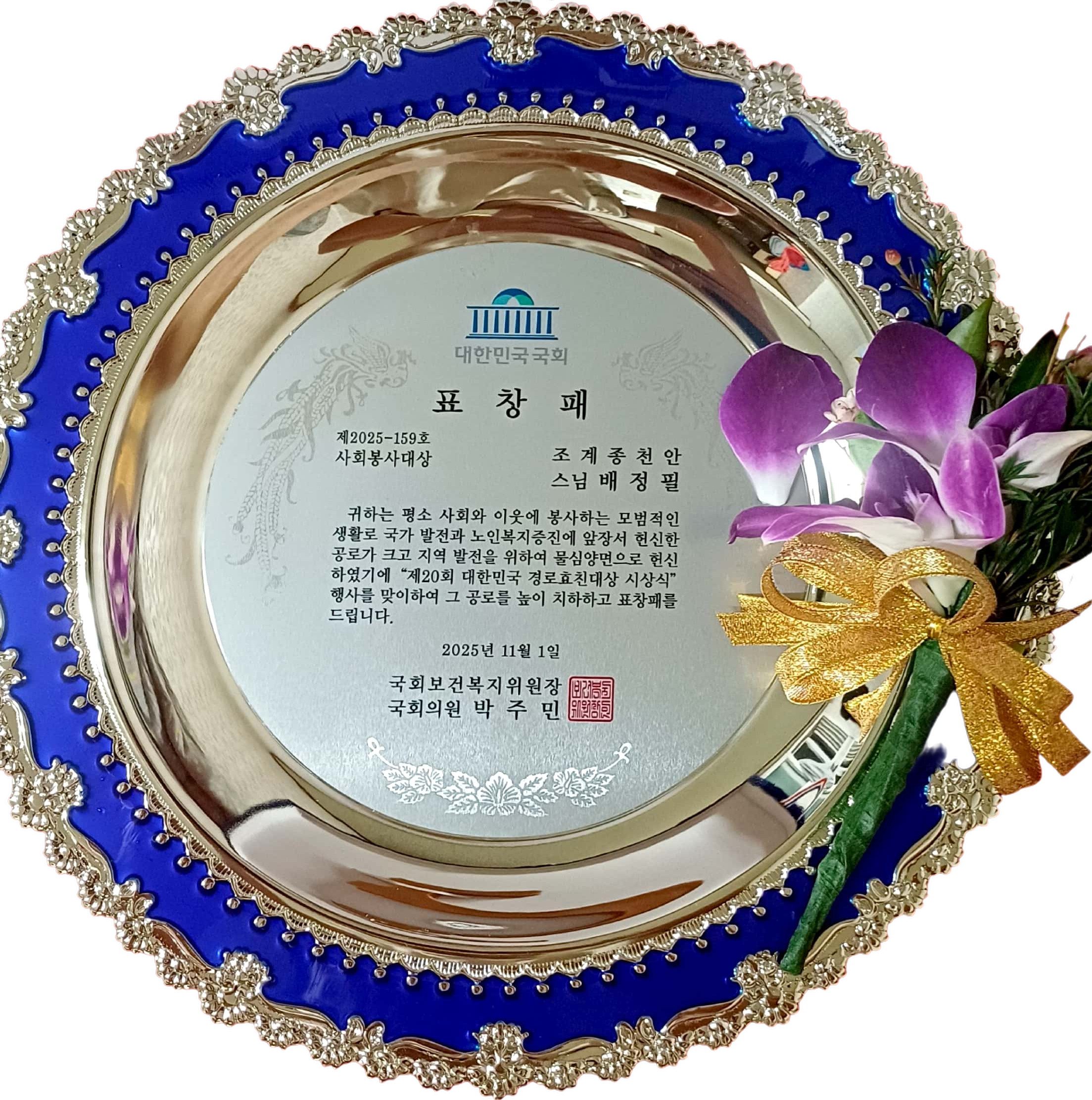 ´ëÇѺұ³ Á¶°èÁ¾ÀÇ * õ¾È½º´Ô (¹èÁ¤ÇÊ) * ÀÌ Á¦20ȸ ´ëÇѹα¹ °æ·Îȿģ´ë»ó ½Ã»ó½Ä¿¡¼ ¡®±â°ø¾à¼Õ ¸íÀÎ ºÎ¹® ±¹È¸ º¸°Çº¹ÁöÀ§¿øÀå»ó¡¯À» ¼ö»óÇÏ´Â ¿µ¿¹¸¦ ¾È¾Ò´Ù.